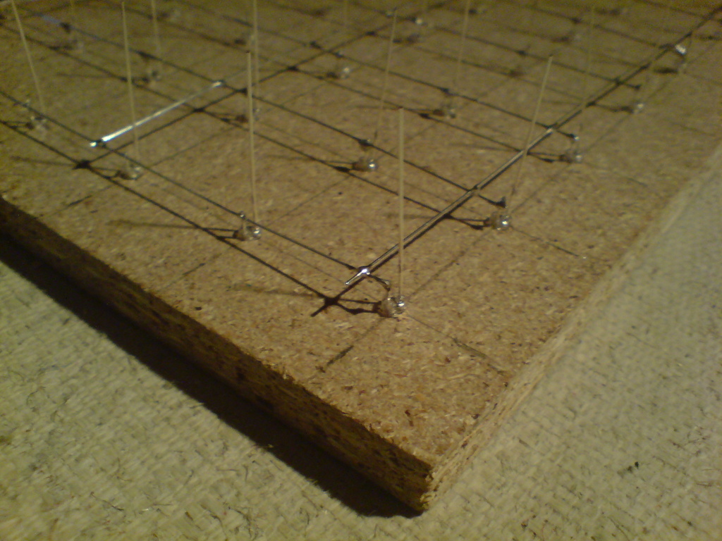 I started with drilling 64 3mm holes (distance between the holes is 30mm) in the ground plane, which is very helpfull for soldering the layers.
