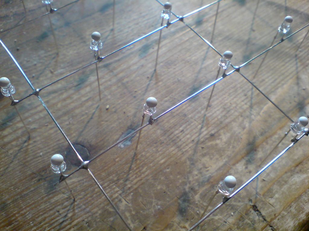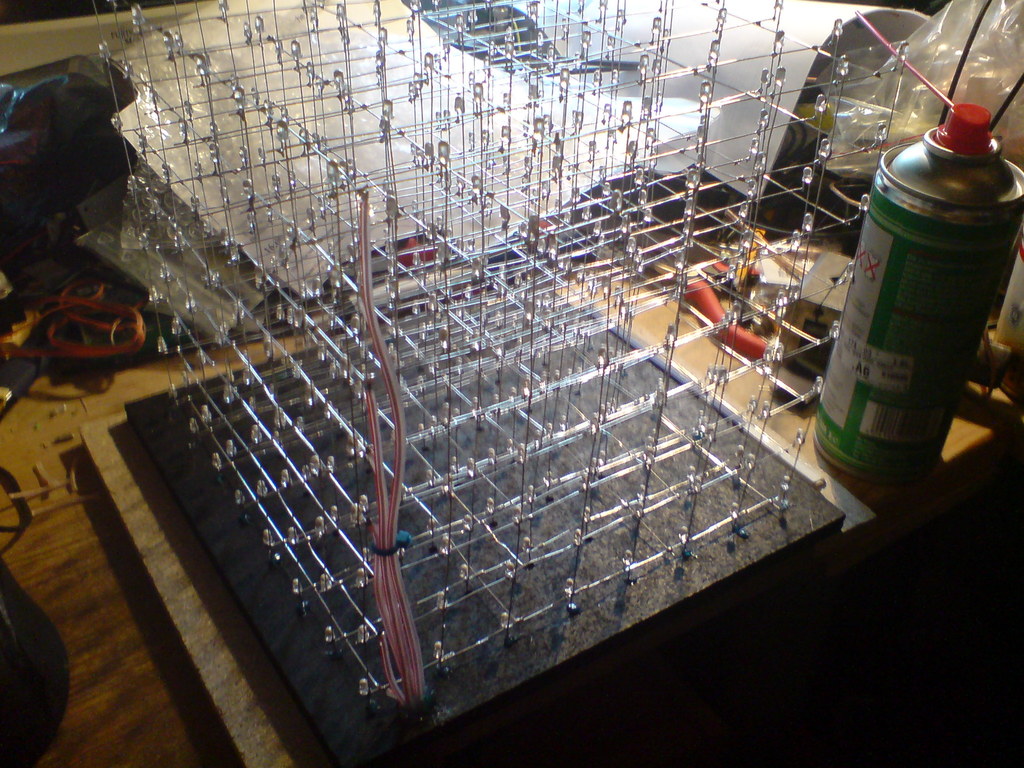 If you have ideas or annotations regarding the code, just email me (fornax at leyanda.de). The cube is organized in a uint8_t [8][8] array, so one frame takes only 64B. This is useful for calculating transformations, or even simple hardcoded animations stored in the flash. The remaining axis for the 3D-cube are the bits themselves. That means I can send the var directly to the port register (to the 8bit d-latches). It takes no more than 70 asm statements to show one frame. I am using an interrupt based viewing as well as a dedicated loop, depending on the current animation (some functions flicker with ISR).
