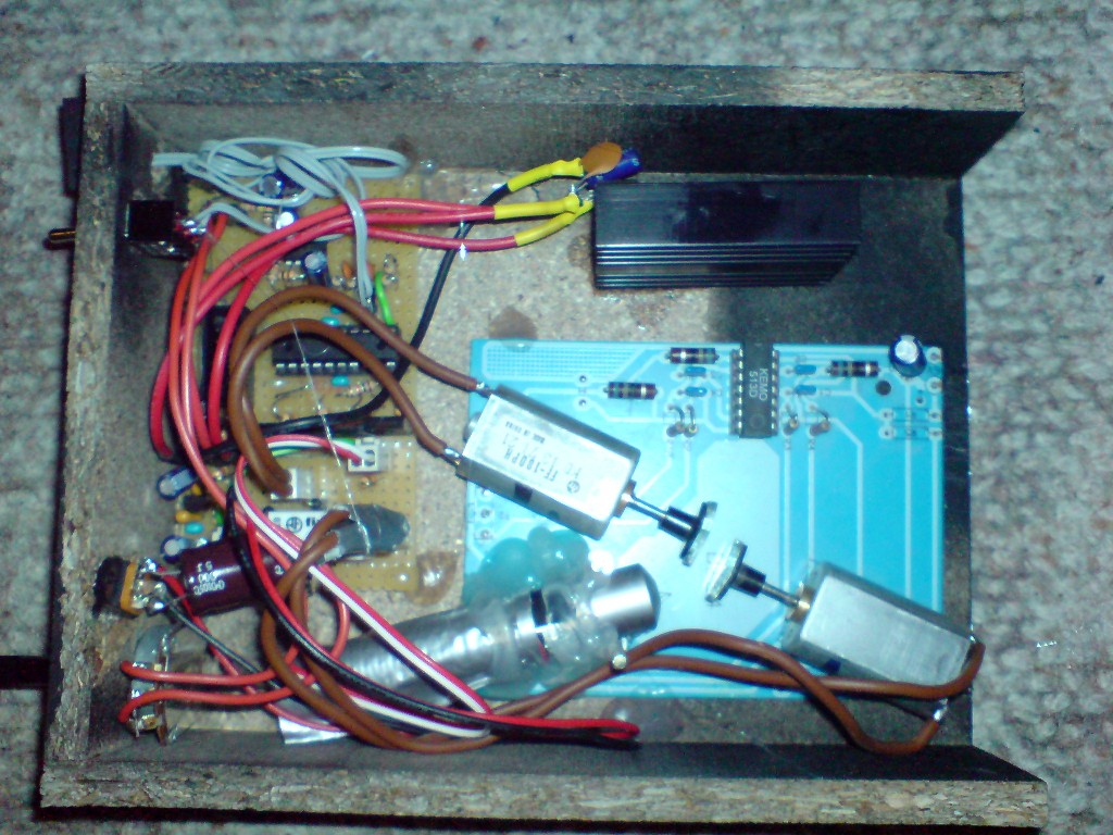 This one started when I found one of those simple lissajous kits I bought years ago. It has 2 DC motors with mirrors on them, you can control their speed and direction with 2 potentiometers. This is unusable if you really want to put the laser as a light effect somewhere, so I build a small controller unit for the motors and the laser. I also replaced the red laser with a green one since they got quite cheap now, are brighter (for the human eye) and the ray is visible even with just 1mW due to the greater rayleigh scattering.