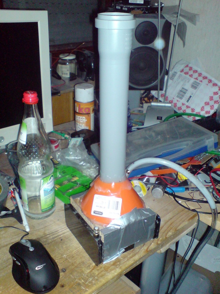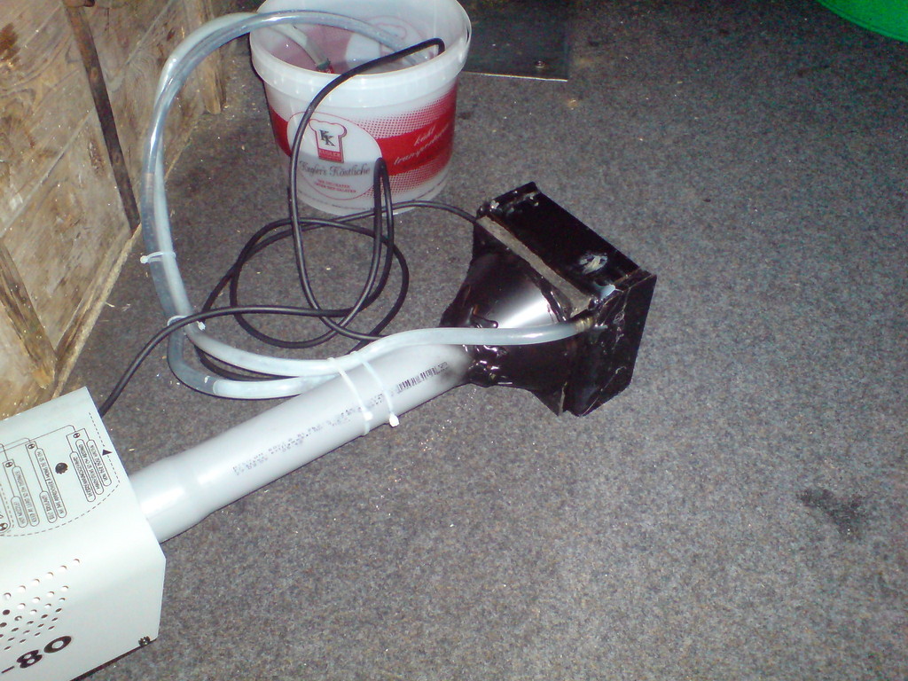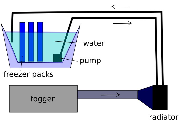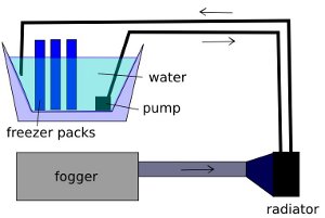 My first prototype was a copper radiator from my old cpu water cooling system, attached to a pvc pipe and a pond pump for the radiator.